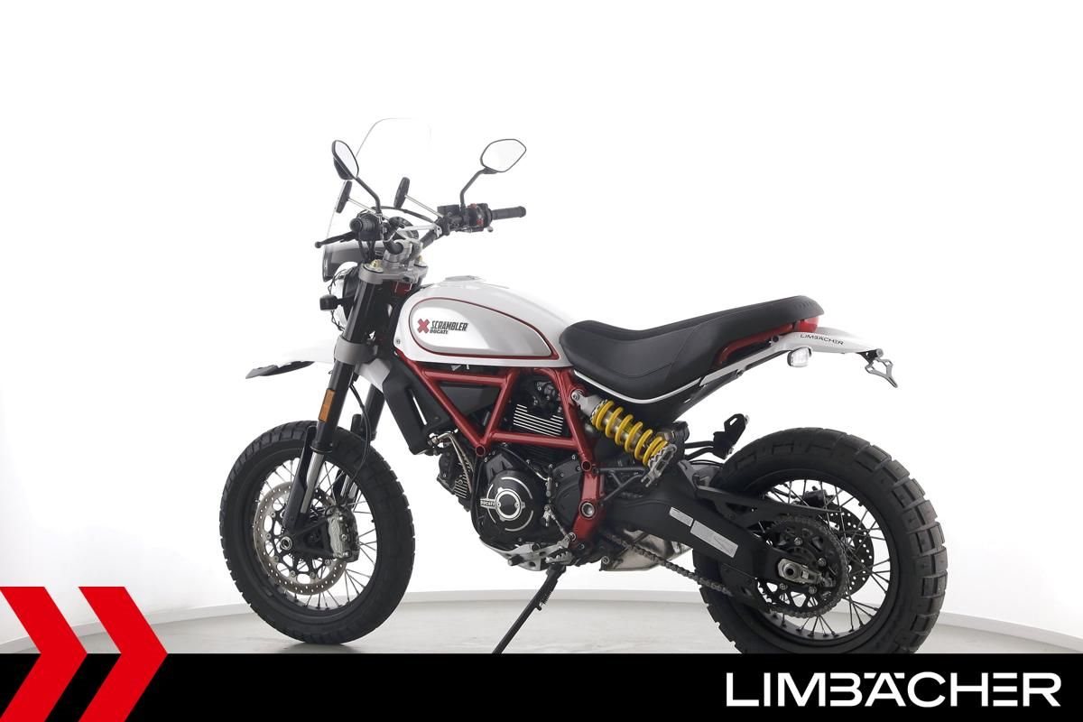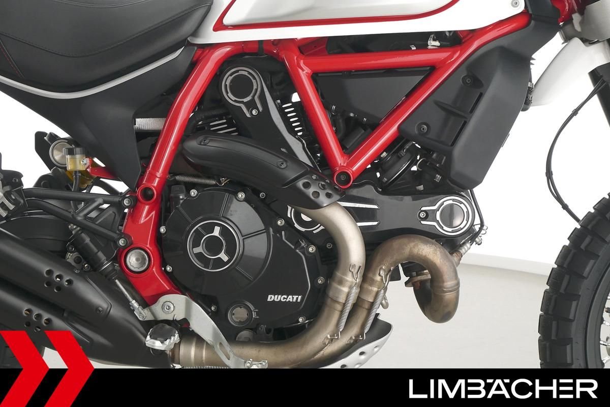 Eine scheckheftgepflegte Ducati Scrambler Desert Sled aus zweiter Hand in sehr gepflegtem Zustand u.a. mit kurzem Kennzeichenhalter sowie großem Windschild.