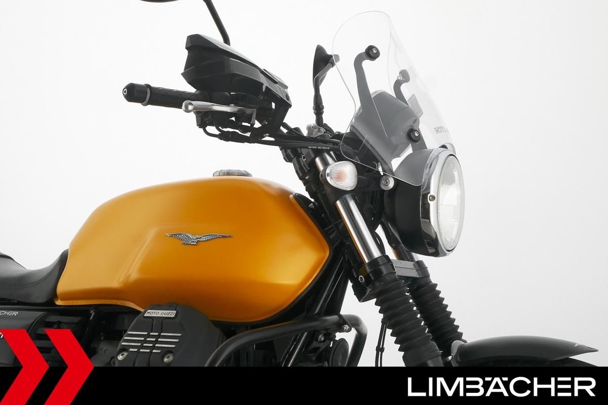 Eine Moto Guzzi V7 III Stone aus zweiter Hand in gepflegtem Zustand u.a. mit Sturzbügel in schwarz sowie Windschild.