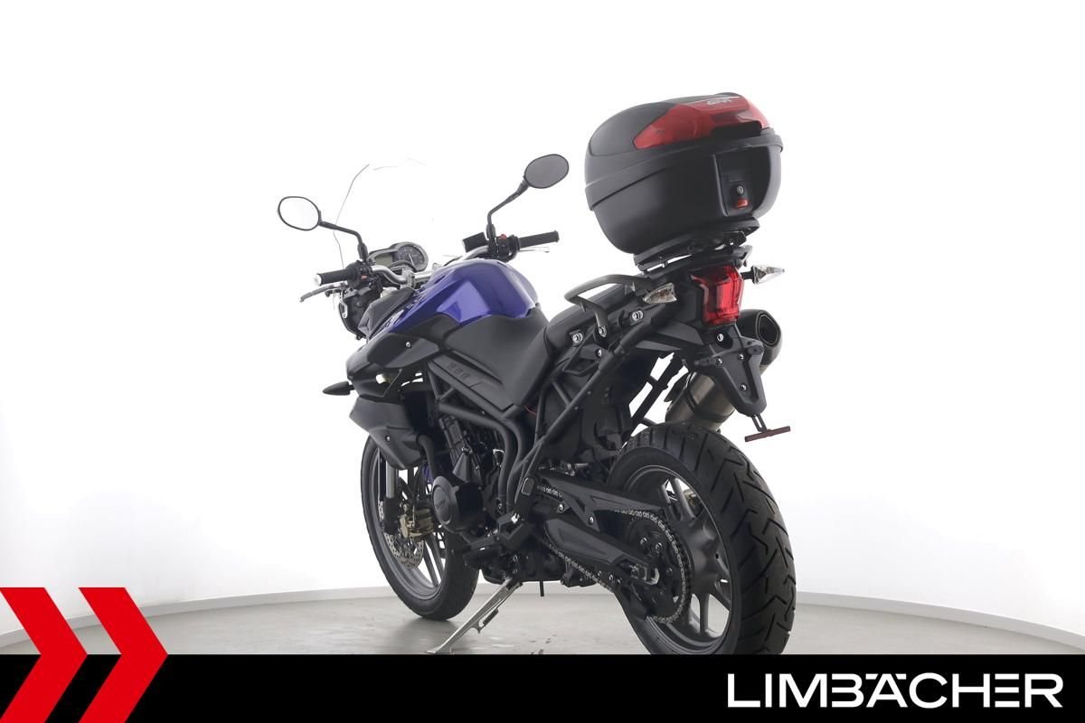 Eine scheckheftgepflegte Triumph Tiger 800 aus zweiter Hand in gepflegtem Zustand u.a. mit Arrow-Endschalldämpfer sowie Givi-Topcase.